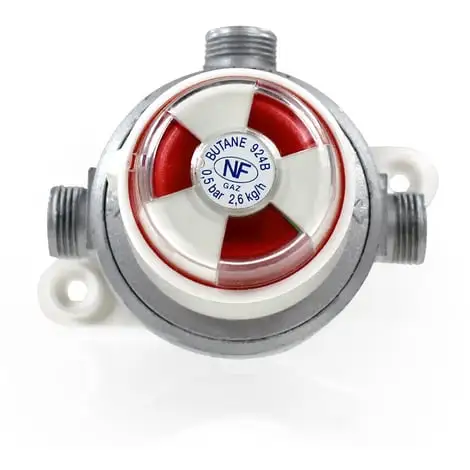 Il est équipé à ses deux entrées de clapet anti-retour pour éviter toute fuite au moment du remplacement d’une bouteille (ce serait le cas si la pression devenait trop faible lors d’un soutirage important).